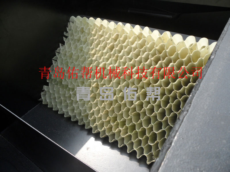 根據(jù)淺池理論發(fā)展而來(lái)的斜板隔油池,是一種異向流分離裝置,其水流方向與油珠運(yùn)動(dòng)方向相反,廢水沿斜板向下流動(dòng),經(jīng)過(guò)斜板和沉淀區(qū)域后,通過(guò)溢流堰排出池體。廢水中密度特別小的油珠在斜板粘附聚集后,沿斜板下表面向上流動(dòng),含油浮渣會(huì)自流進(jìn)集油槽,或經(jīng)過(guò)刮渣機(jī)推送到集油槽內(nèi),經(jīng)管道排出。密度相對(duì)比較大的懸浮顆粒等會(huì)沉降到斜板上表面,污泥聚集到一定程度,會(huì)沿斜板滑落到池體底部的集泥槽內(nèi)。斜板材質(zhì)一般為玻璃鋼材料,表面光滑、均勻。安裝方法大多采用波紋板峰對(duì)峰的方式,中間形成的空隙即為污水流經(jīng)的通道。