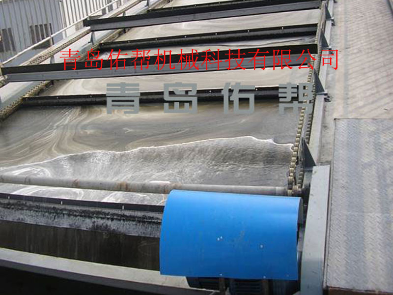 鏈板式刮油刮泥機設有兩條平行封閉的牽引鏈條,上面裝有多塊刮板,在驅動裝置的帶動牽引下,刮板沿沉淀池上下所設導輪和導軌循環運動,利用刮板的循環緩慢移動,將液面漂浮的油渣從入水端刮集到出水端的集油管中排出池外,同時將沉降于池底的泥沙從出水端刮集到入水端的集泥槽中經排泥閥排出,從而初次完成機械凈化污水的目的。